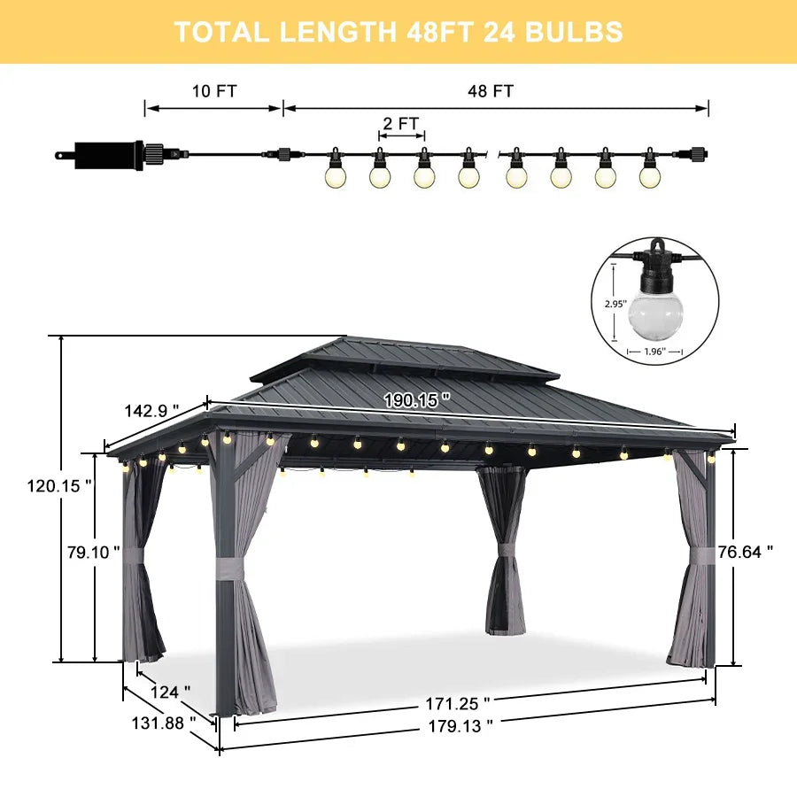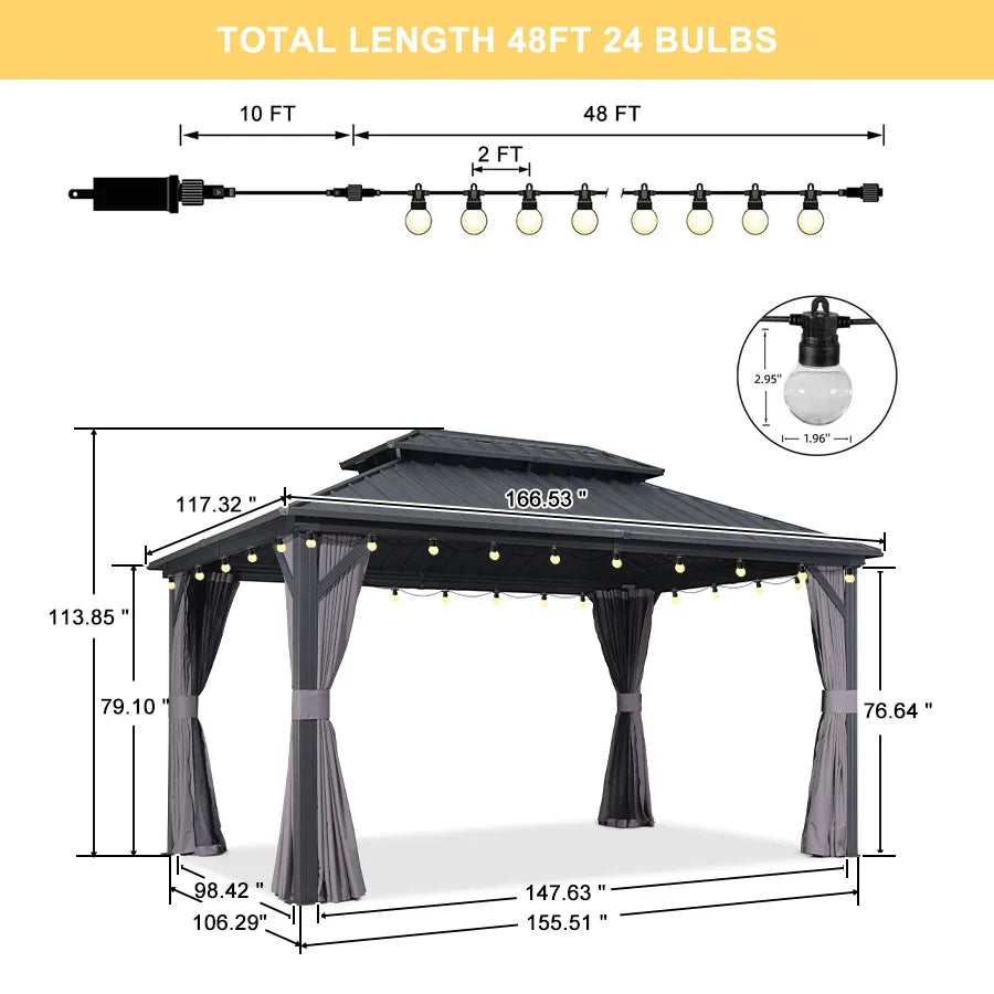 - 【Ceiling Hooks】Comes with built-in, high-quality, sturdy ceiling hooks designed to easily hang your favorite chandelier or other decorative items. Outdoor gazebo can easily be transformed into a comfortable and light-filled gathering place to spend precious time with family and friends.