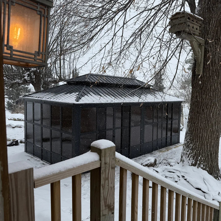 Add a timeless, sophisticated look to your outdoor space with our Gray Sunroom. Featuring a durable gray powder-coated frame, it ensures you'll enjoy a comfortable outdoor space all year round. Its spacious interior is perfect for personalized touches such as comfortable seating, lighting, all of which you can tailor to your tastes. It provides a cozy, safe space for you to enjoy the changing seasons.